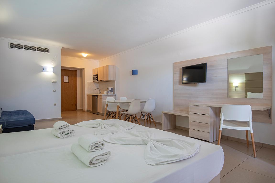 Op slechts enkele meters van het heerlijke Lambi strand liggen de comfortabele Appartementen Aegean Blu. Ideaal dus wanneer je optimaal wilt genieten van een vakantie vol zon, zee en strand! Maar ook bij Aegean Blu is het echt genieten. Rondom het leuke zwembad kun je in een ligstoel wegdromen onder de warme Griekse zonnestralen. Bij de gezellige poolbar geniet je van een verfrissend drankje of een lekkere snack om even helemaal bij te komen. Heb je zin om de gezelligheid van Kos-Stad op te zoeken? Op slechts 10 minuten lopen  ben je al in de levendigheid van deze populaire badplaats. Dit wordt een heerlijke vakantie op het mooie eiland Kos!