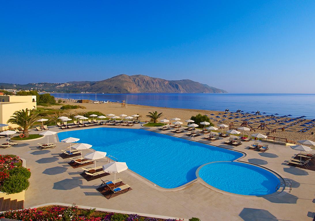 Hotel Pilot Beach Resort is een heerlijk 5-sterrenhotel met alle luxe en faciliteiten die je mag verwachten van dit niveau. Het hotel staat bekend om de perfecte combinatie tussen vriendelijke service, traditionele (bouw)aspecten en luxe faciliteiten. En niets is hier minder waar. Al is het alleen al om de fantastische ligging; direct aan het heerlijke brede zandstrand van Georgioupolis. Het uitzicht op het blauwe water en de bergen is adembenemend.