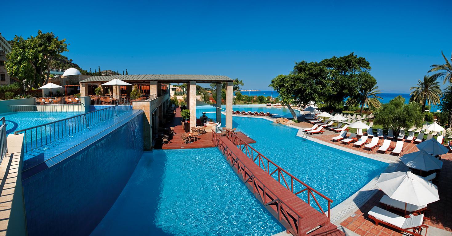 Het luxe vijfsterrenhotel Rhodes Bay (voorheen Amathus Beach) staat bekend om haar goede service en kwaliteit. Het gastvrije hotel is tegen de heuvel van Ixia gebouwd en biedt een prachtig uitzicht op zee en een kamer met zeezicht is dan ook zeker aan te raden. De rustige ligging en de luxe faciliteiten zorgen voor een ontspannen verblijf en het personeel doet er alles aan om je het zo comfortabel mogelijk te maken. Het hotel ligt direct aan het strand, te bereiken via een voetgangerstunnel, en hier staan de bedjes en parasols al voor je klaar. Blijf je liever bij het zwembad, er zijn er maar liefst twee in totaal. In de wellness kun je terecht voor een heerlijke behandeling en je kunt een balletje slaan op het tennisveld. In dit leuke hotel hoef je jezelf geen minuut te vervelen. Fijne vakantie!