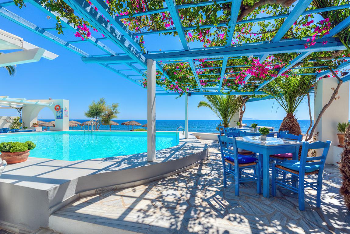 Wauw! Het kleinschalige Hotel Sigales ziet er zó sprookjesachtig uit. Het is helemaal in de stijl van de Cycladen gebouwd. Het stijlvolle plekje dat uit slechts 26 kamers, verdeeld over twee gebouwen bestaat, is wit met typerende blauwe details. Het ligt direct aan het zwarte, vulkanische strand van Kamari waar je kunt genieten van de kraakheldere zee. Het centrum van dit gezellige plaatsje is na een korte en gezellige wandeling te bereiken.