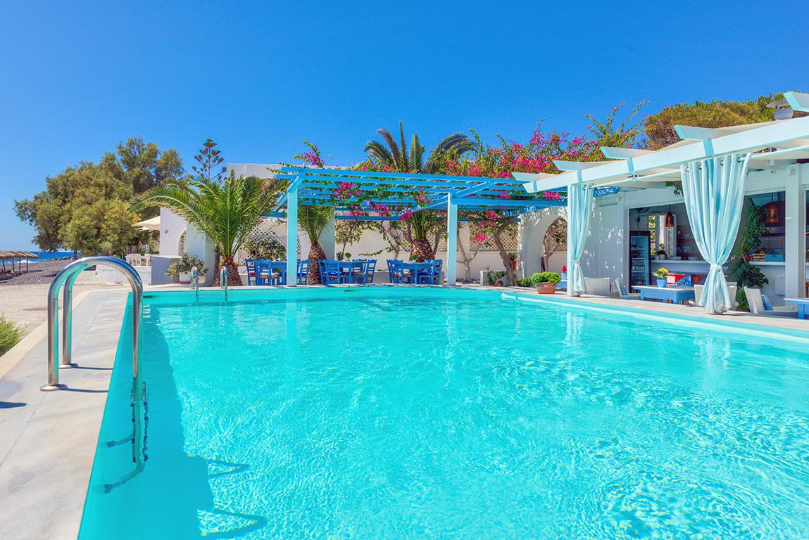 Wauw! Het kleinschalige Sigalas ziet er zó sprookjesachtig uit. Het is helemaal in de stijl van de Cycladen gebouwd. Het stijlvolle plekje dat uit slechts 26 kamers, verdeeld over twee gebouwen bestaat, is wit met typerende blauwe details. Het ligt direct aan het zwarte, vulkanische strand van Kamari waar je kunt genieten van de kraakheldere zee. Het centrum van dit gezellige plaatsje is na een korte en gezellige wandeling te bereiken.
