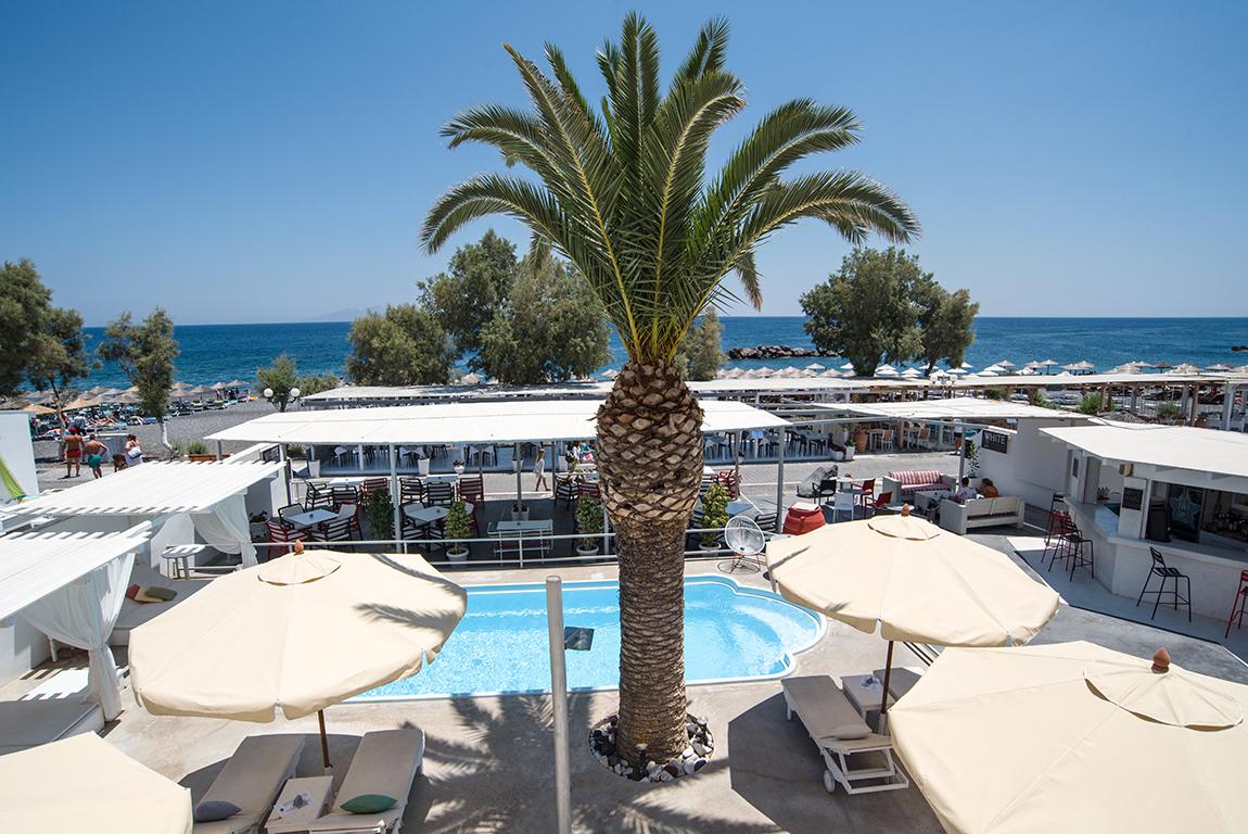 Het elegante Hotel Beach Boutique ligt direct aan het zandstrand en in het centrum van Kamari. Door deze centrale ligging zijn winkeltjes en restaurants in de omgeving gemakkelijk te voet te bereiken. Dit designer hotel heeft een trendy inrichting; in iedere kamer hangt een ander modern kunstwerk. De rest van het hotel kenmerkt zich vooral door de witte inrichting met rode en zwarte accenten.